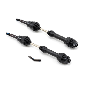 Traxxas steel constant velocity shafts offer the ultimate in torque handling and efficient power transfer. The outer U-joints are lubricated and sealed by a rubber boot for maximum protection against the elements, and the U-joint pins are held captive so you never have to worry about losing a pin. Gleaming nickel-plated shafts and black silicone boots add a custom look.